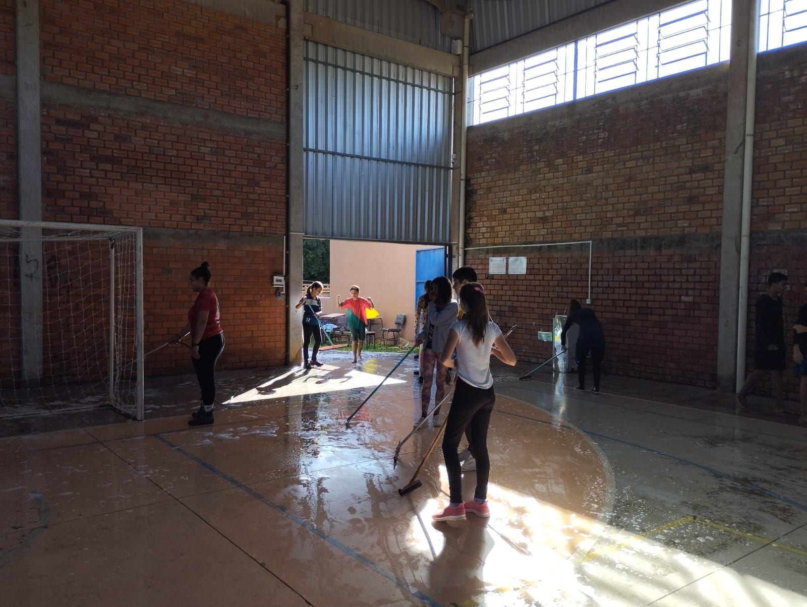 O Bola pra Frente, projeto da Fundação Antonio Meneghetti (FAM), reuniu alunos, pais e professores em um esforço conjunto para realizar uma limpeza no ginásio da Escola Érico Veríssimo, de Restinga Sêca. O local utilizado para os treinos do projeto foi invadido pelas águas nas enchentes que ocorreram no Rio Grande do Sul nas últimas semanas.