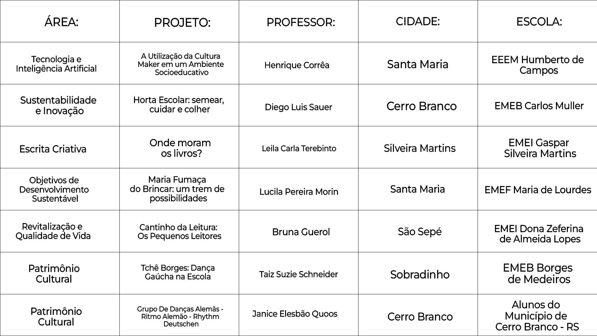 Em 2025, o Formar para Transformar teve 52 projetos, divididos em seis áreas: Tecnologia e Inteligência Artificial; Sustentabilidade e Inovação; Patrimônio Cultural; Escrita Criativa; Objetivos de Desenvolvimento Sustentável; e Revitalização e Qualidade de Vida. O evento de encerramento destacou o projeto mais representativo de cada área. Confira na tabela abaixo os vencedores.